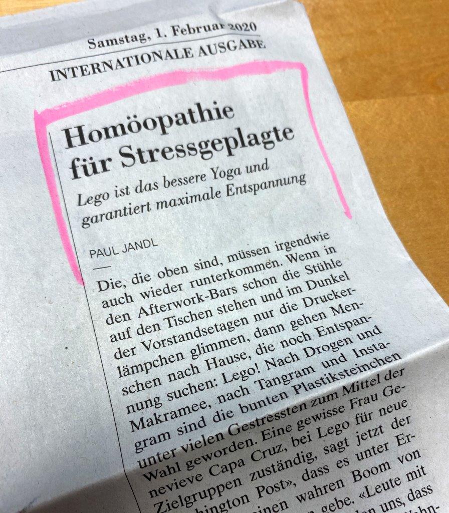 Irgendwann im Februar, um genau zu sein, am 1. Februar 2020, kam in der Neuen Zürcher Zeitung ein Artikel mit der Überschrift "Homöopathie für Stressgeplagte" und dem Untertitel "Lego ist das bessere Yoga und garantiert maximale Entspannung". Nein, ich lese nicht die internationale Presse und nein, ich machte auch keinen Ausflug in die Schweiz. Auch wenn es der 1. Februar war. Die besagte Seite flatterte mir von meinem besten Freund ins Haus. Eigentlich ein bekennender Playmobil-Liebhaber. Bis "damals". Eine gewisse Überzeugungsarbeit ist mir inzwischen schon gelungen ;-)